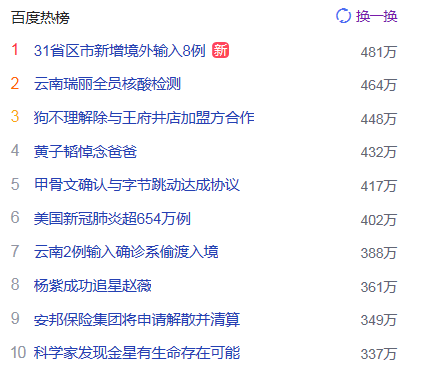 2.云南瑞麗全員核酸檢測 獵頭熱點熱度464萬