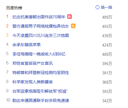 1.紀念抗美援朝出國作戰70周年 獵頭熱度熱點489萬