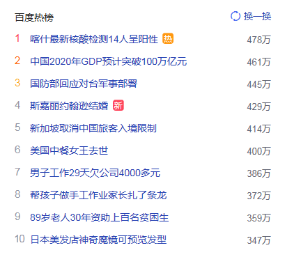 1. 喀什最新核酸檢測14人呈陽性 獵頭熱度熱點478萬