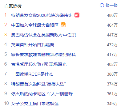 1. 特朗普發(fā)文稱2020總統(tǒng)選舉違憲 獵頭熱度熱點(diǎn)480萬