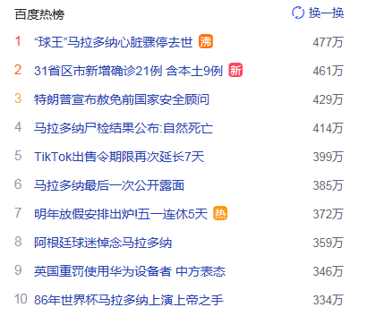 1. “球王”馬拉多納心臟驟停去世 獵頭熱度熱點(diǎn)477萬(wàn)